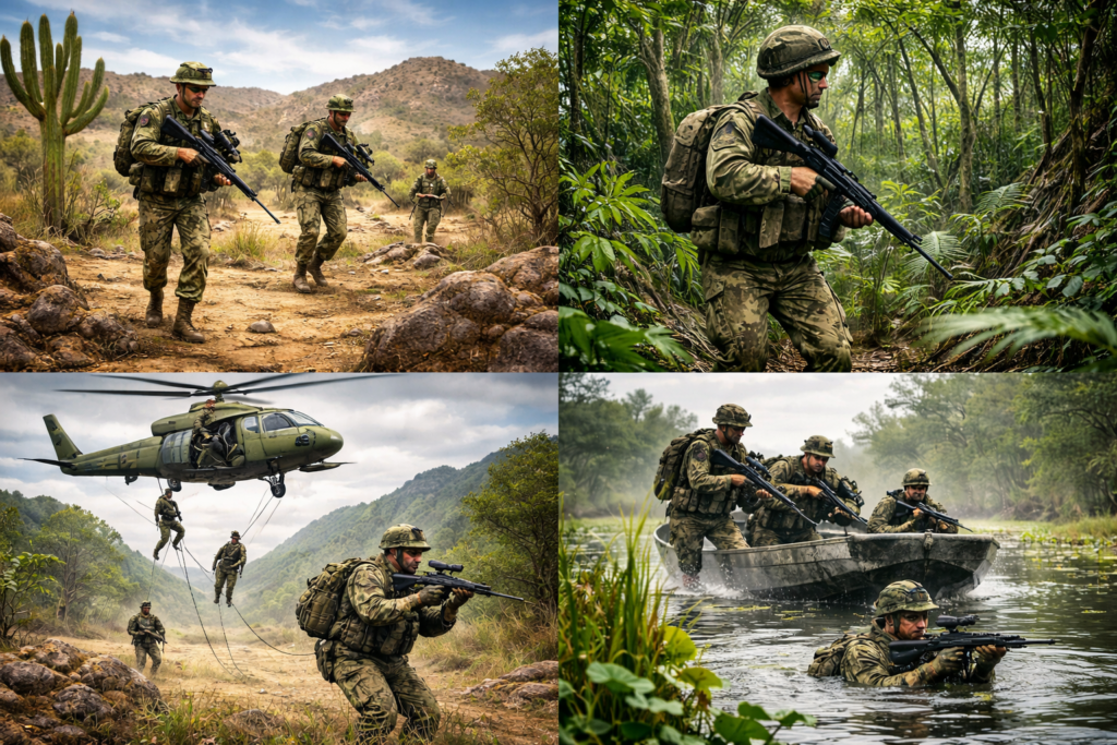 O Estágio Básico do Combatente de Montanha (EBCM), por sua vez, prepara o militar para operar em terrenos íngremes e de difícil acesso, com ênfase em infiltração, exfiltração, resgate de feridos e domínio de equipamentos especializados. De modo semelhante, o Estágio de Adaptação ao Pantanal capacita o combatente para atuar em áreas alagadas, priorizando técnicas de patrulha, sobrevivência, travessia de cursos d’água e adestramento aquático, indispensáveis àquele bioma.