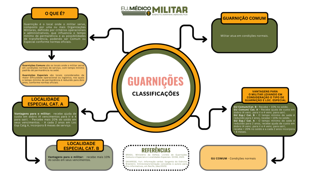 De forma objetiva, guarnições são os locais onde o militar serve, compostos por uma ou mais Organizações Militares. Elas são definidas com base em critérios operacionais, administrativos e logísticos e influenciam diretamente o tempo mínimo de permanência na sede e as possibilidades de transferência. As guarnições podem ser classificadas como Comuns, quando oferecem condições normais de serviço, ou Especiais, nos casos em que há maior dificuldade operacional ou localização estratégica, com tempo mínimo de sede reduzido para dois anos.